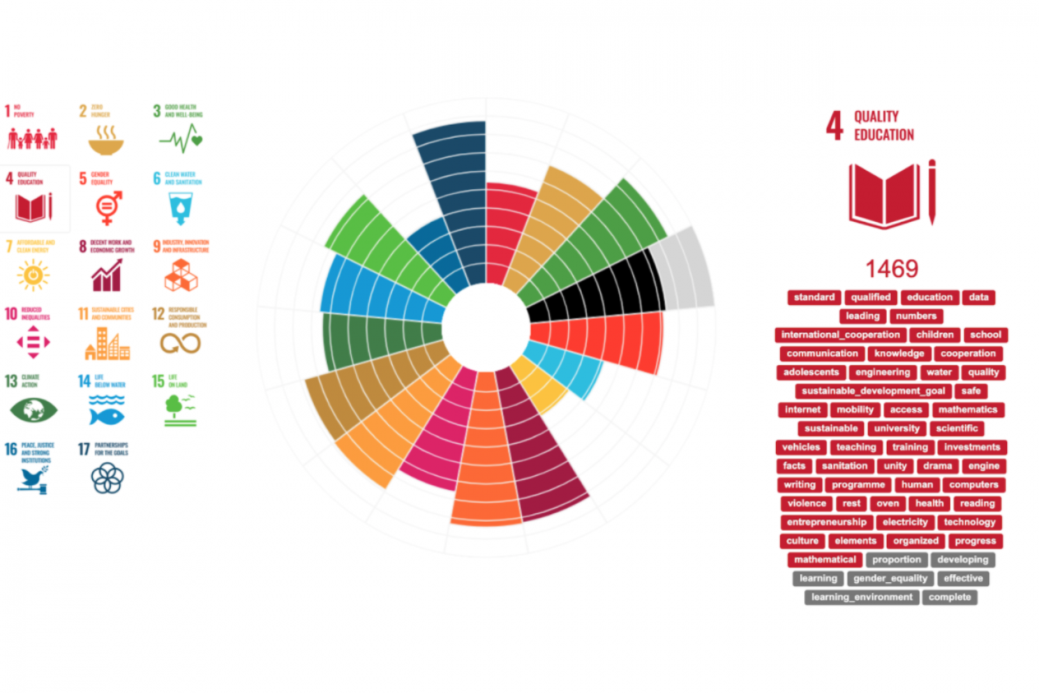 The solution compares the data on education (Learning Activities) produced by Metropolia with the Sustainable Development Goals. The figure (in the featured picture) shows the simulation between Agenda 2030 Objective four, Quality Education with the descriptions of Metropolia’s educational offering. Each goal is given its own score, which shows the relevance of the correspondences in relation to the other goals. In addition to numerical scores, the tool offers valuable information about the SDG-related themes that are not found in the curriculums.